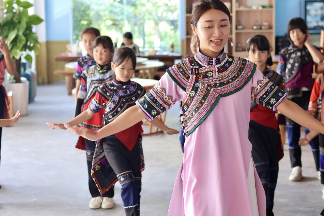 在被誉为“云中仙境”的阿者科村,袁老师与哈尼孩子一同跳起国家级非物质文化遗产——哈尼族“乐作舞”。他们以梯田为舞台、以夕阳为灯光,共赴一场民族艺术与自然相融的浪漫盛会。阳光下,孩子们服饰上的彝绣花纹熠熠生辉;舞动中,彝族姑娘帽檐的银铃清脆作响。她们的眼睛明亮如湖水,倒映着对未来的渴望。这不仅是一次舞蹈教学,更是一次文化的传承,让古老的民族艺术在新时代焕发出勃勃生机。